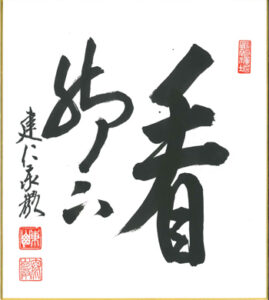 これは今から約900年前の故事に由来します。中国宋代に五祖法演という禅僧がおられました。ある日、三人の弟子と夜道を行こうとした時、突然一陣の風が吹き、手にしていた行灯の灯が消えてしまいました。一瞬で辺りは真っ暗闇になり、一歩も前に進めない状況になりました。そんな折に法演禅師は弟子達に対し「暗い夜道を歩く時は灯りが必要となる。さあ、今この暗闇の中をどのように進むのか」と迫りました。弟子達はそれぞれに智慧を絞り自らの心境を一句に込めて述べますが、禅師はなかなか頷きません。最後に圜悟克勤が答えた「看脚下」という一句に対してのみ、法演禅師は「その通りだ」と絶賛したといいます。